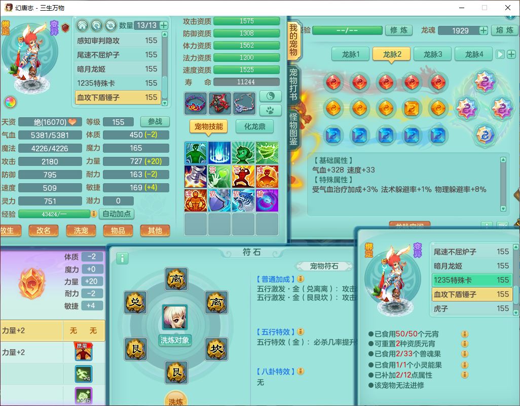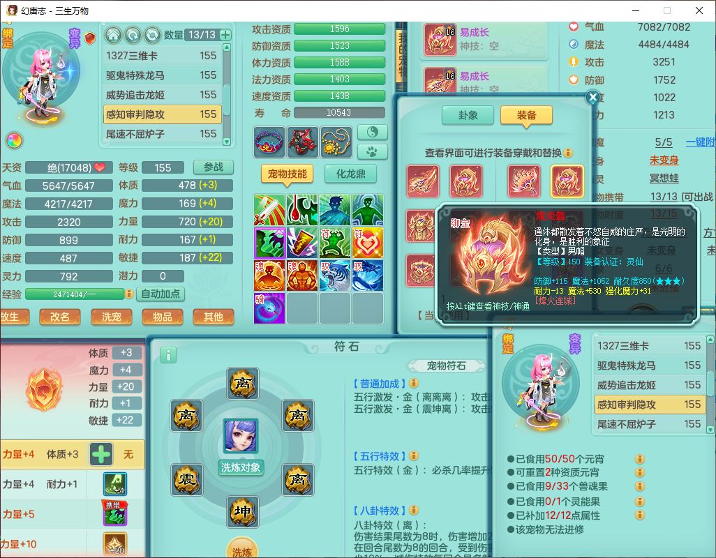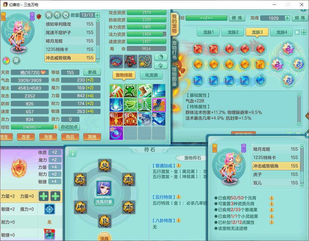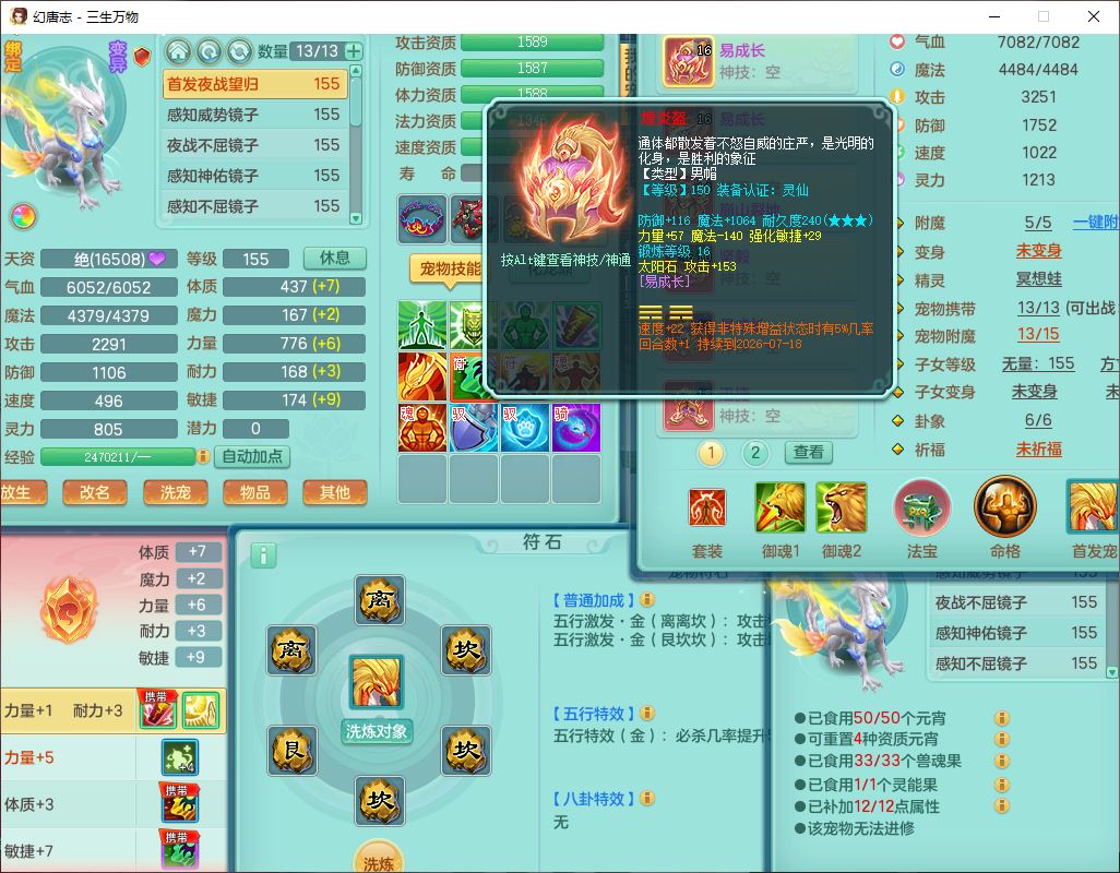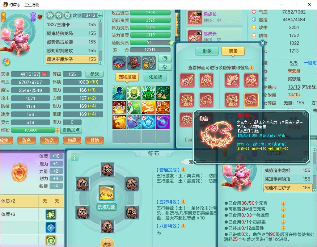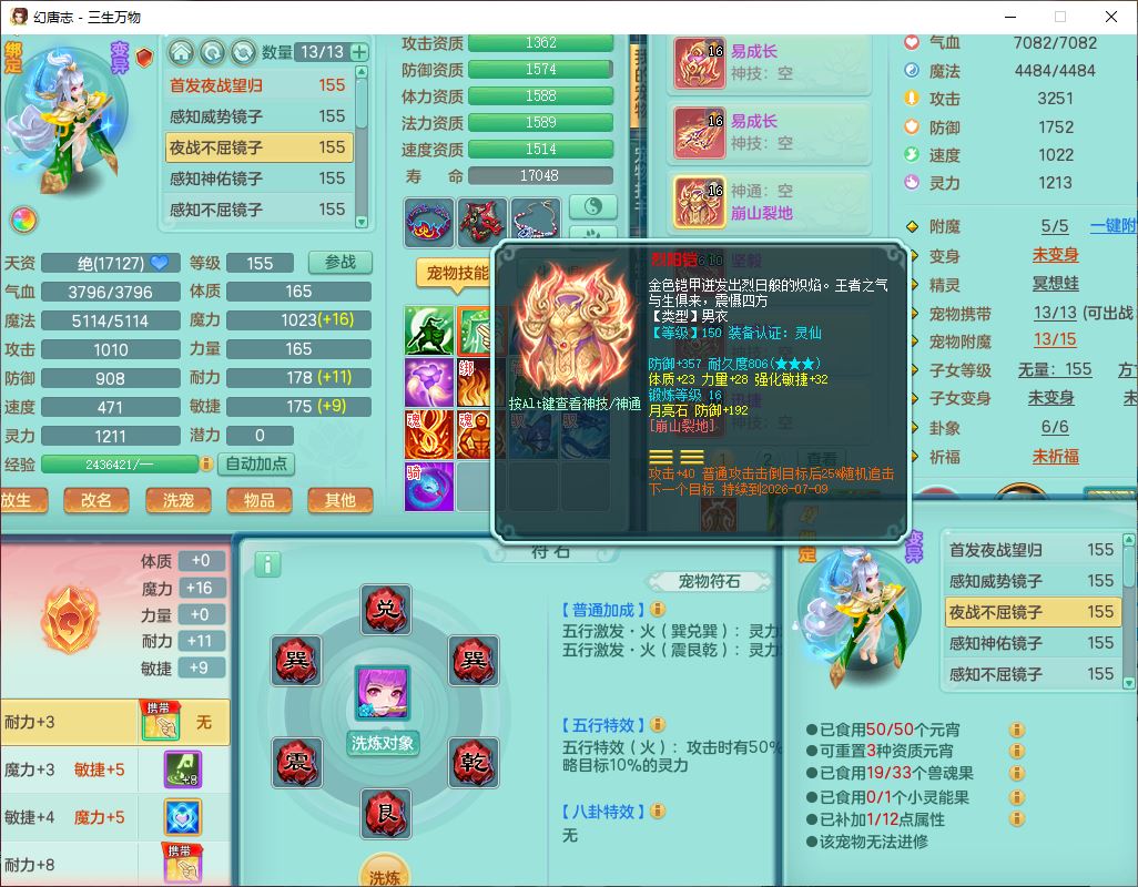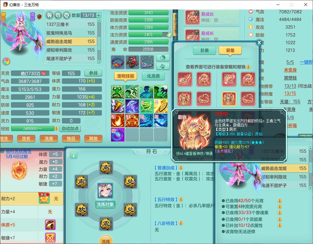 ss10494三生万物159男万兽【马到成功+火焰之力】精灵舞,1内(带祥云)1望归4镜花2龙姬1金炉,7觉醒3四字综合7只满果子,装备齐全,926单加Y武器,崩山衣服,坚毅项链,迅捷鞋子,一套双法缭法系装备,击退罗汉武器,法缭衣服,法缭蓄力鞋子,鼎4.5,庭院155,20个内丹碎片,1双人飞行坐骑