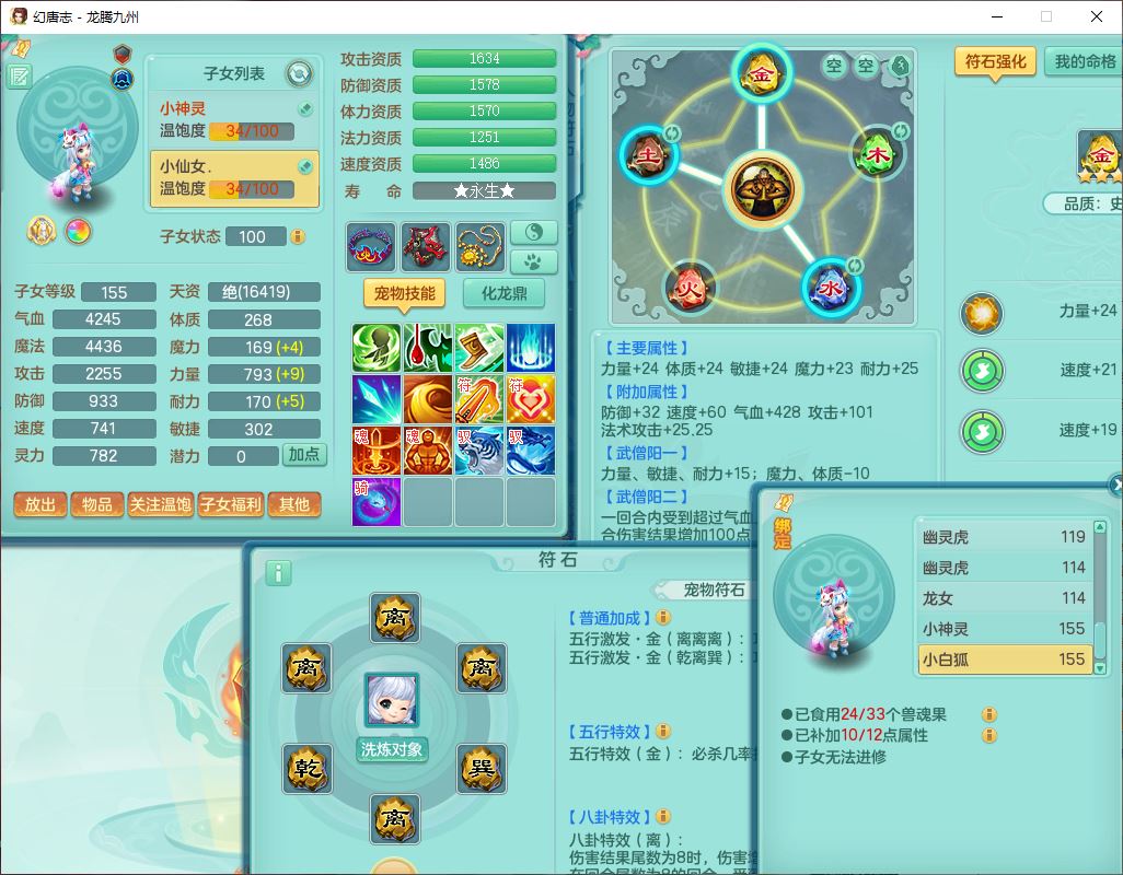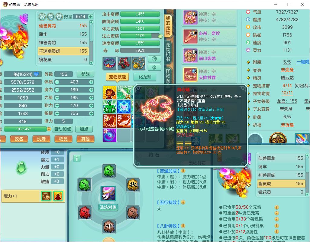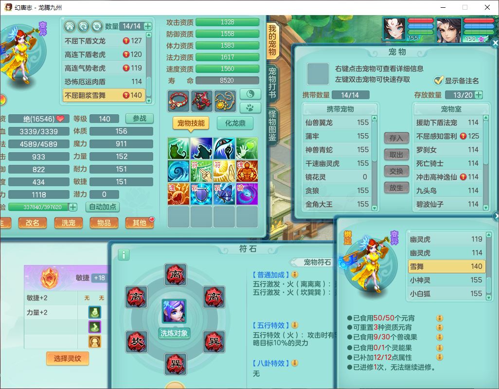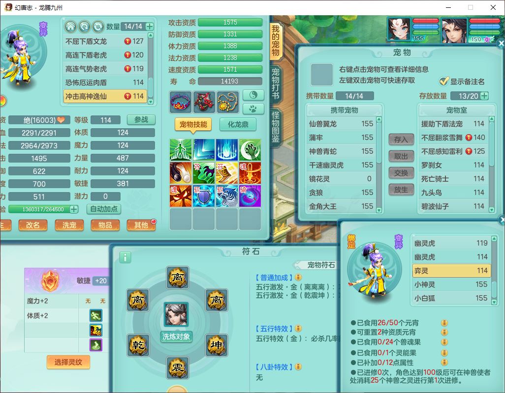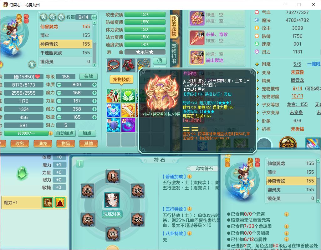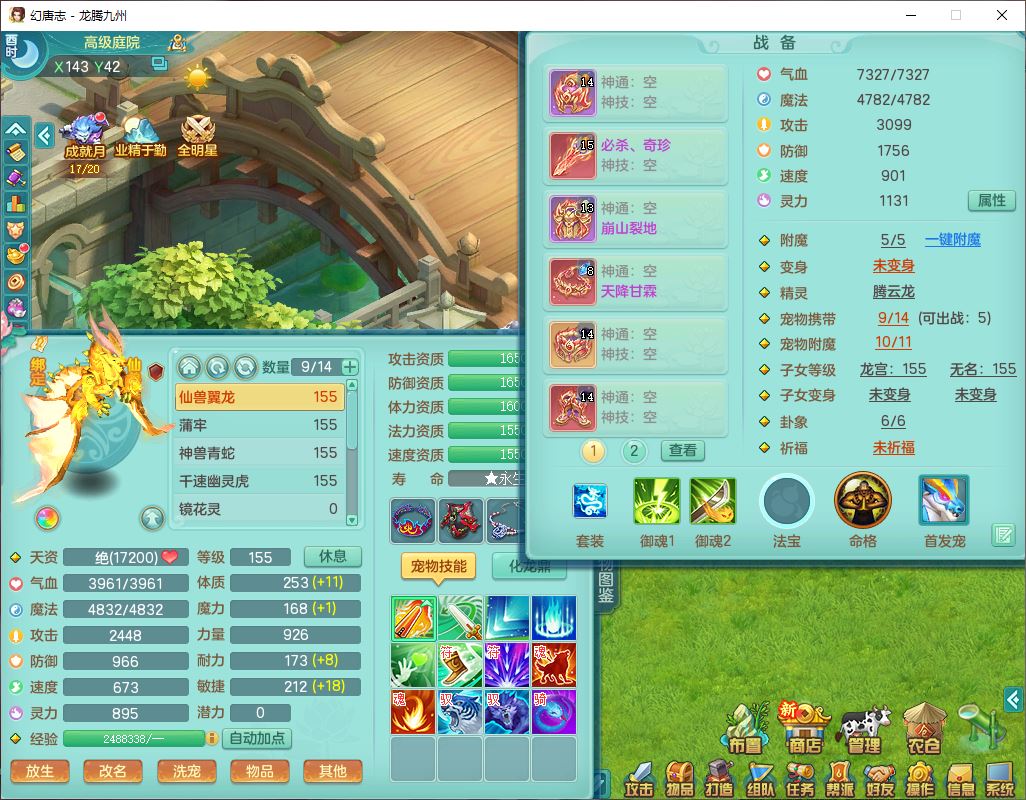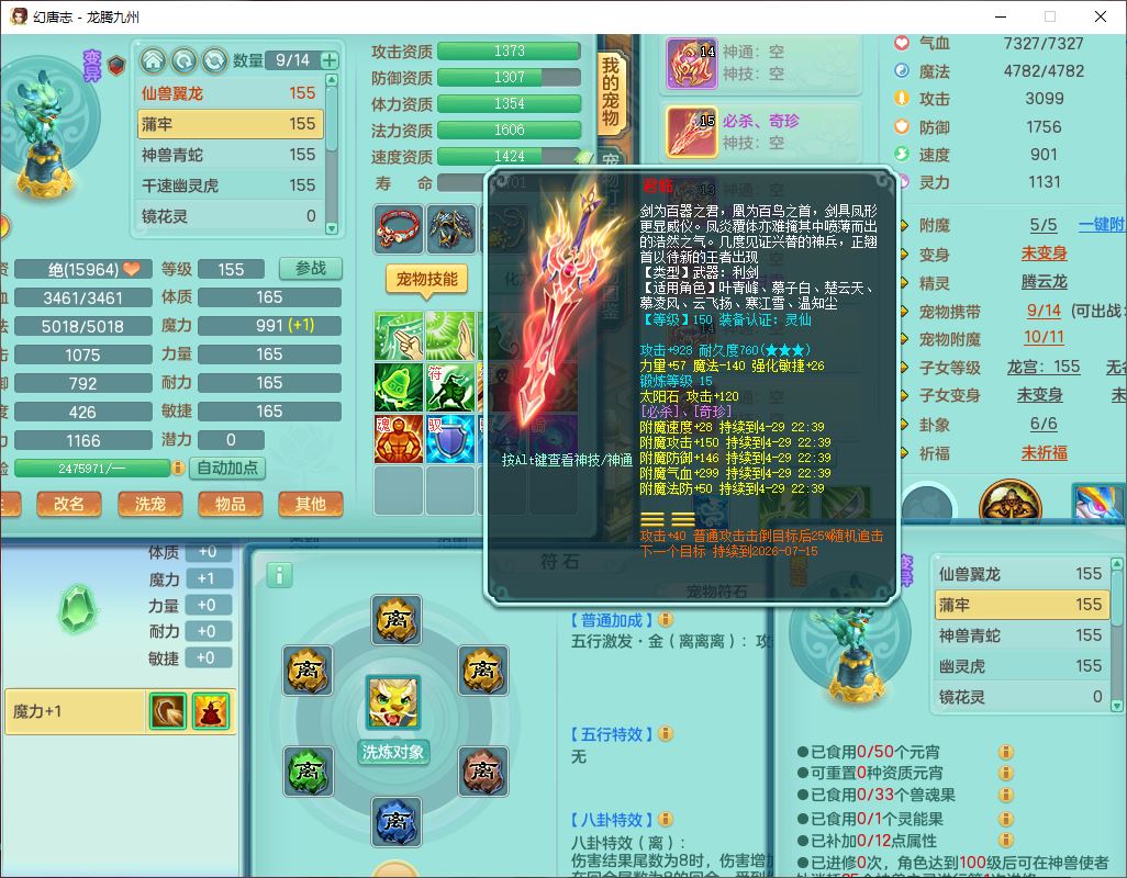 71495WH龙腾九州150男天宫精灵舞,1龙1青蛇(无内)1镜花,装备齐全,必杀武器,崩山衣服,蛟龙五件套,2孩子(龙宫+无名),11个仙兽灵,29个内丹碎片,1双人坐骑
