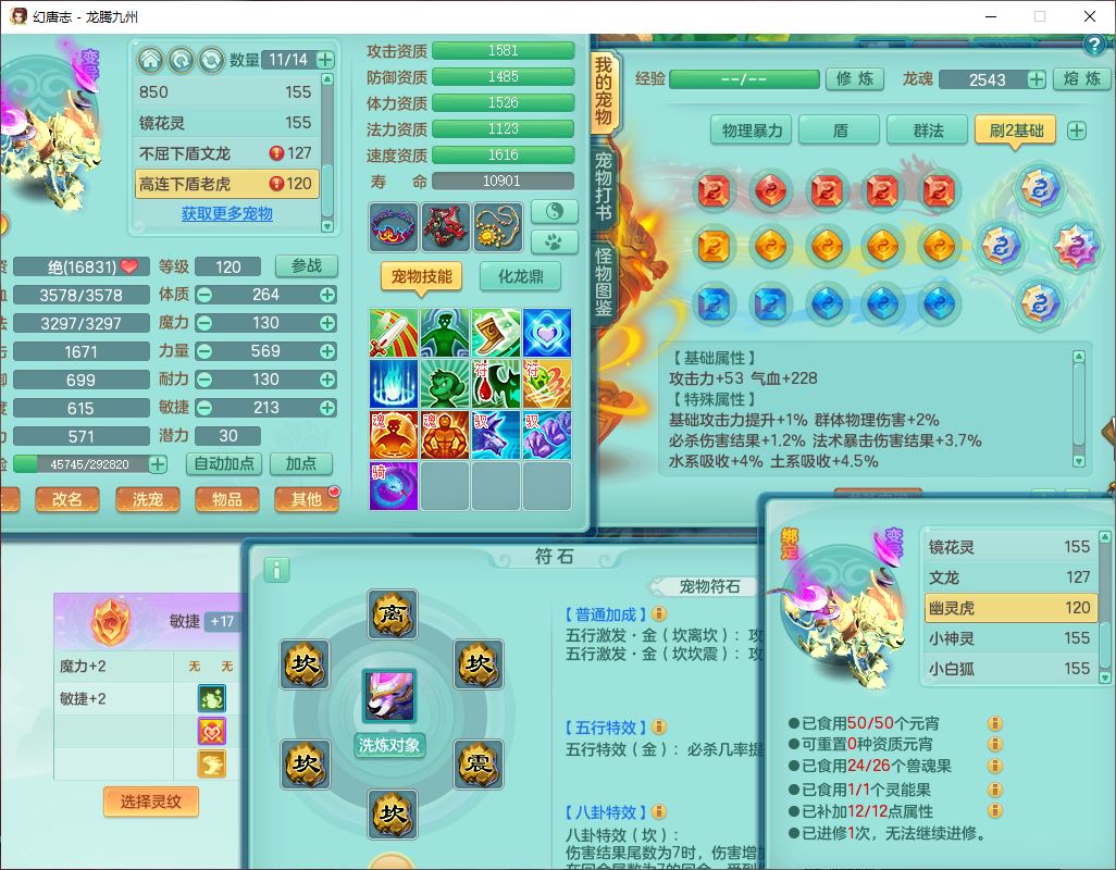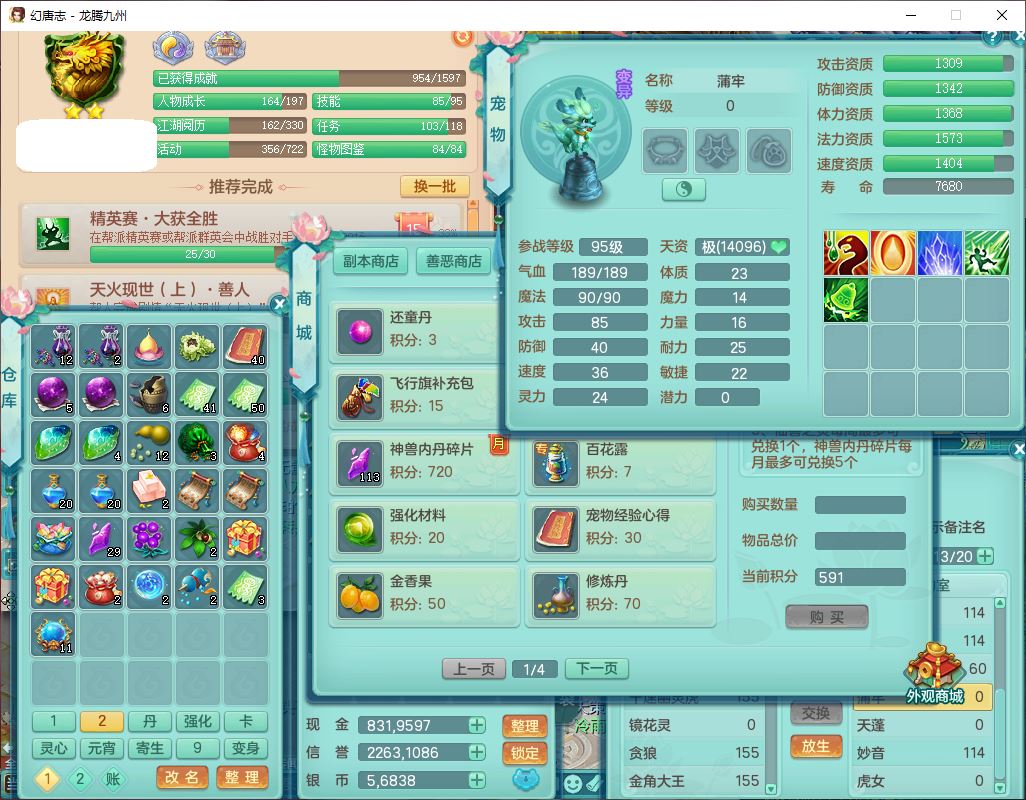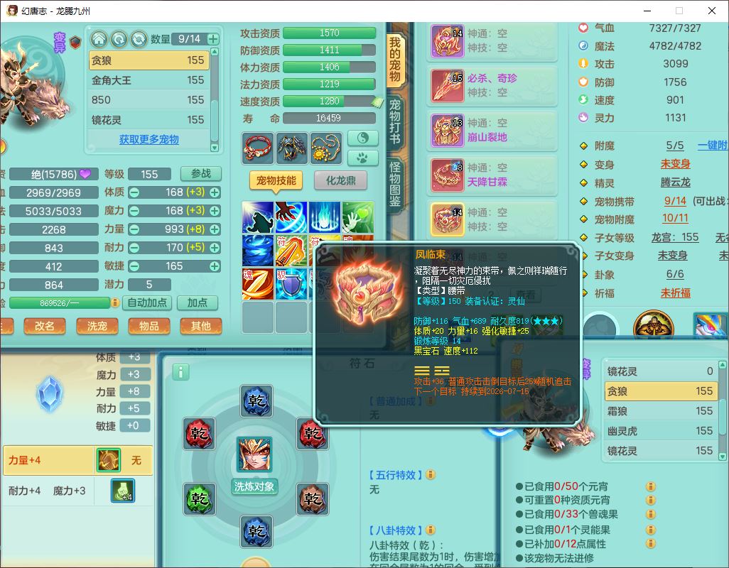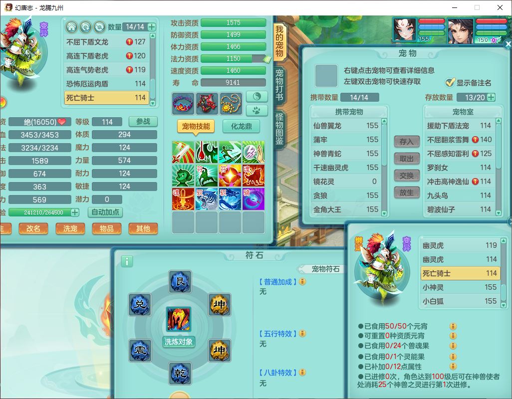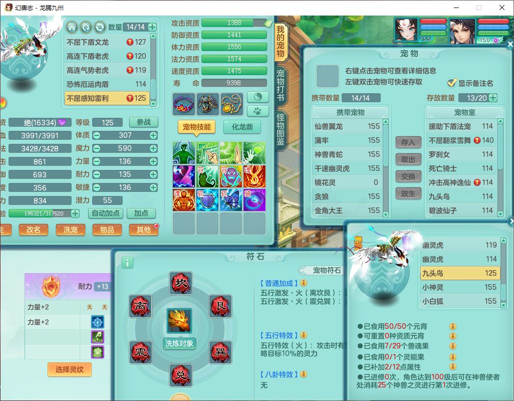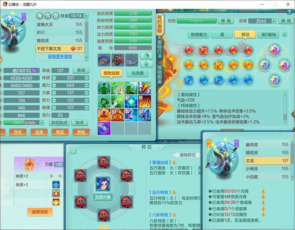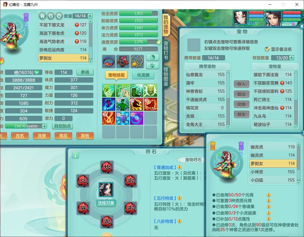 71495WH龙腾九州150男天宫精灵舞,1龙1青蛇(无内)1镜花,装备齐全,必杀武器,崩山衣服,蛟龙五件套,2孩子(龙宫+无名),11个仙兽灵,29个内丹碎片,1双人坐骑