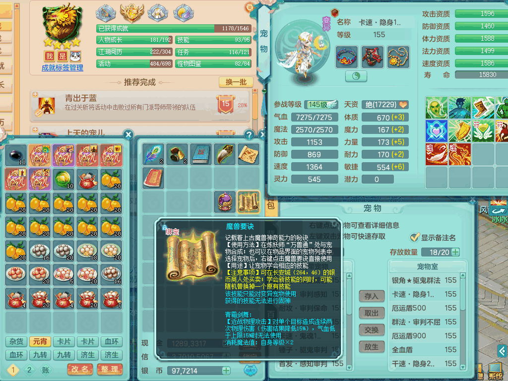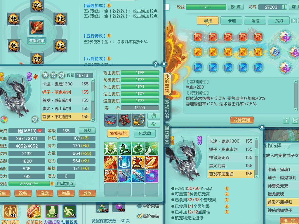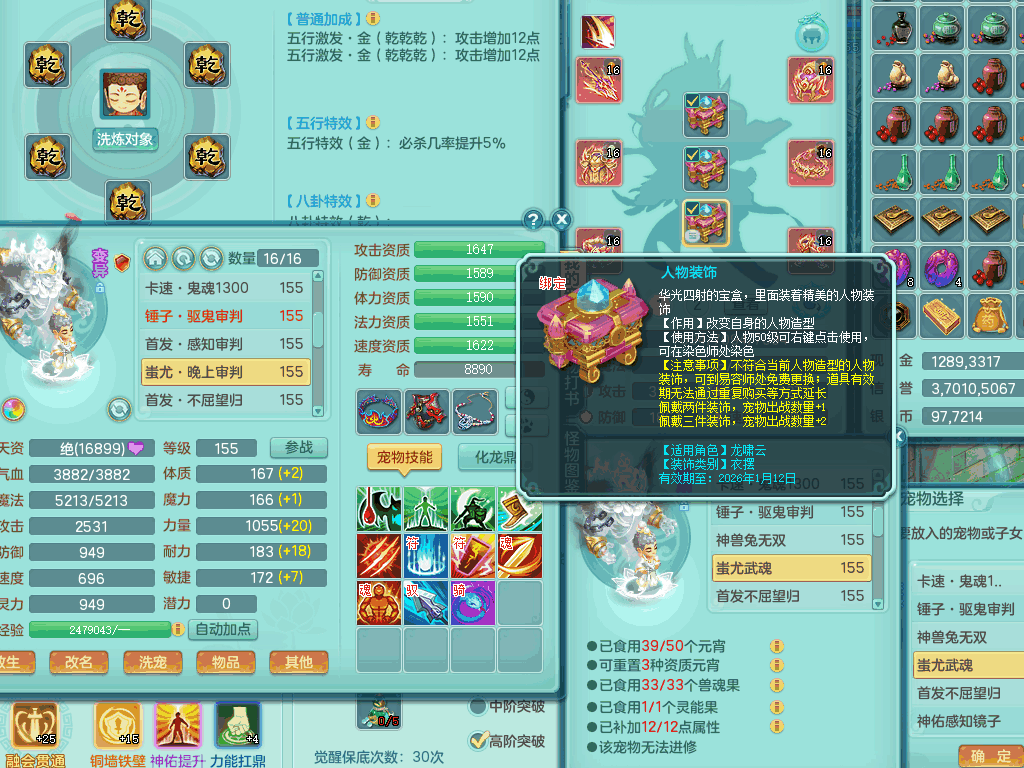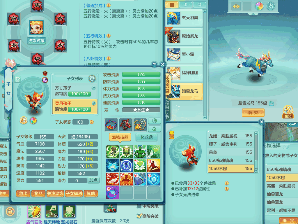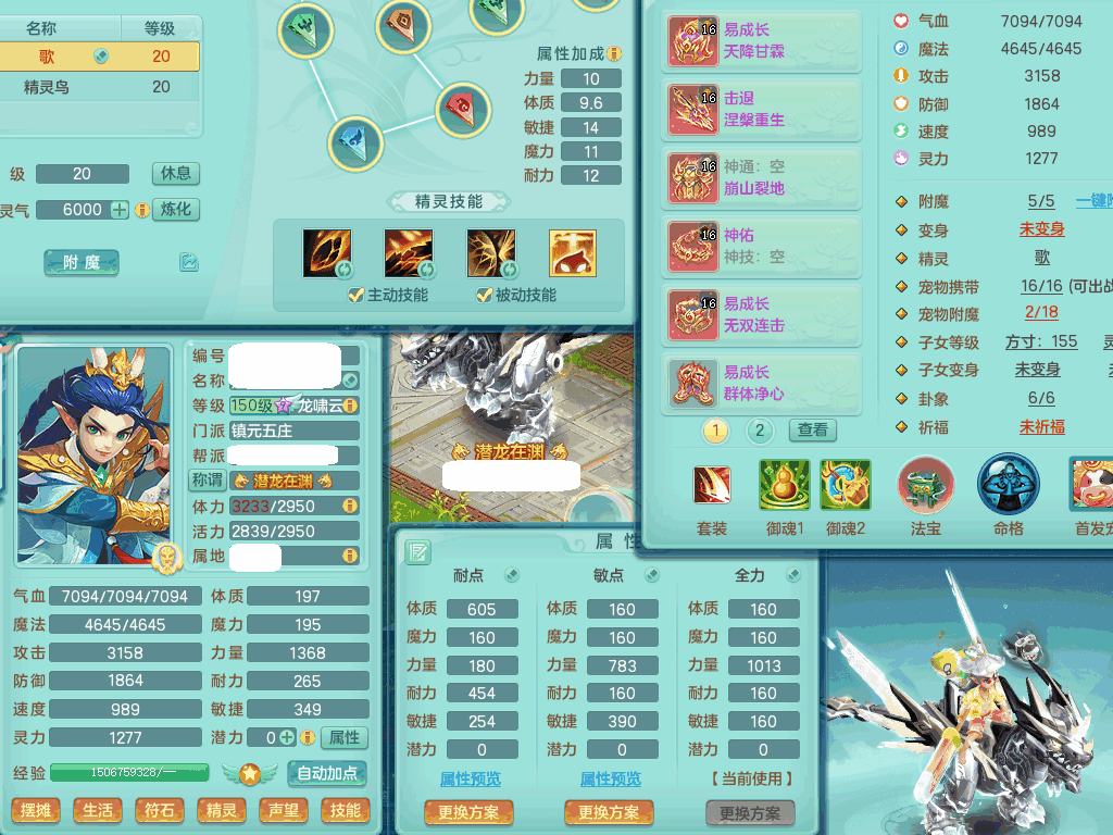 lt8105 【潜龙在渊】浪淘沙159男五庄,精灵歌,5内胆龙,2内胆神+1神兽内胆,【10只觉醒,已潜龙】,8位靓号,6宠皮,3只六技能镜花灵,1只六技能龙姬,2特殊(双星,青霜),神佑单加50项链,易成长晶清单加53鞋子,2套装备,封印慈航单加55头,5.5基础鼎+70攻+280血,15个格子,8个纯六字,5个五字,22只满果子,宠排在榜,经验修炼成就在榜,原始暴龙泰坦+洪荒+西瓜冰武器,带161天月卡。2980邮箱