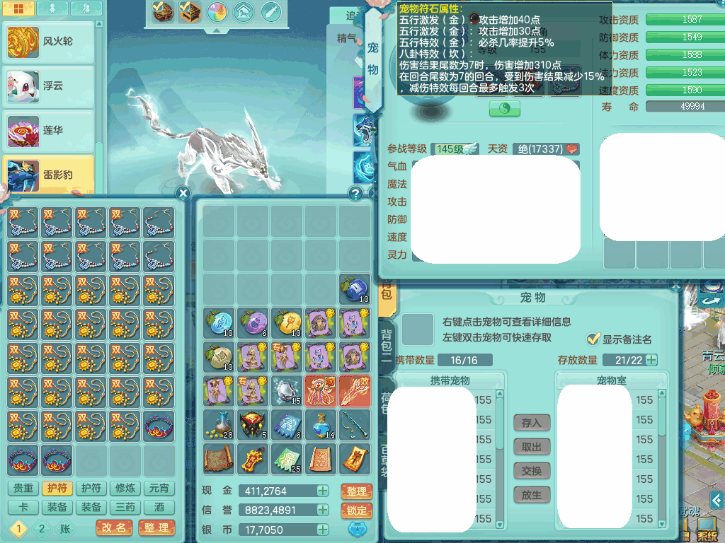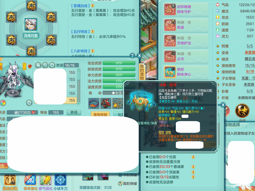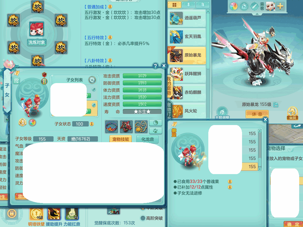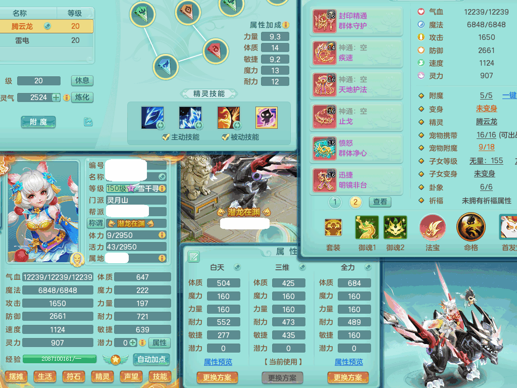jn8405 【潜龙在渊】今年勇159女灵月山,精灵歌+舞,9龙7龙皮,3内胆神,4破镜,【16觉醒,已潜龙】,4宠皮,4位靓号,5只六技能镜子,1只六技能龙姬,3特殊(噬风,流星,灵傀),迅捷明镜单加56鞋子,有崩山单加53衣服,928狂暴单加54武器,6.0基础鼎+70攻、280血,15个格子,15个六字,4个五字,27只满果子,宠排在榜,经验修炼成就在榜,2页永久称谓,9个坐骑,暴龙泰坦+西瓜冰。2980邮箱