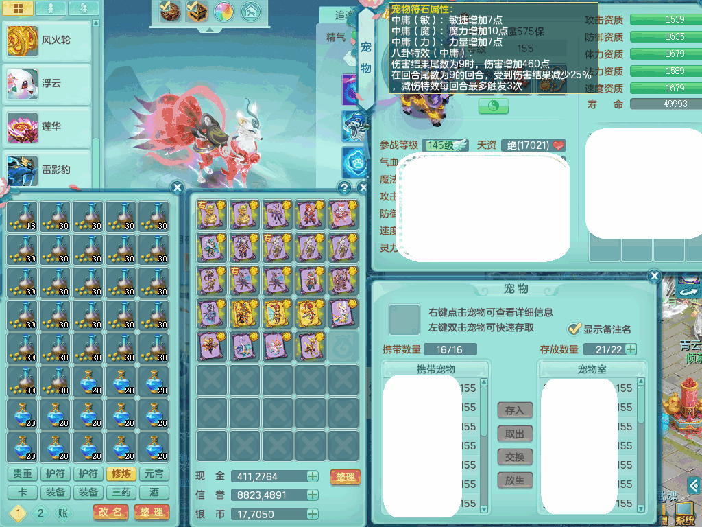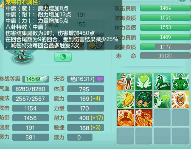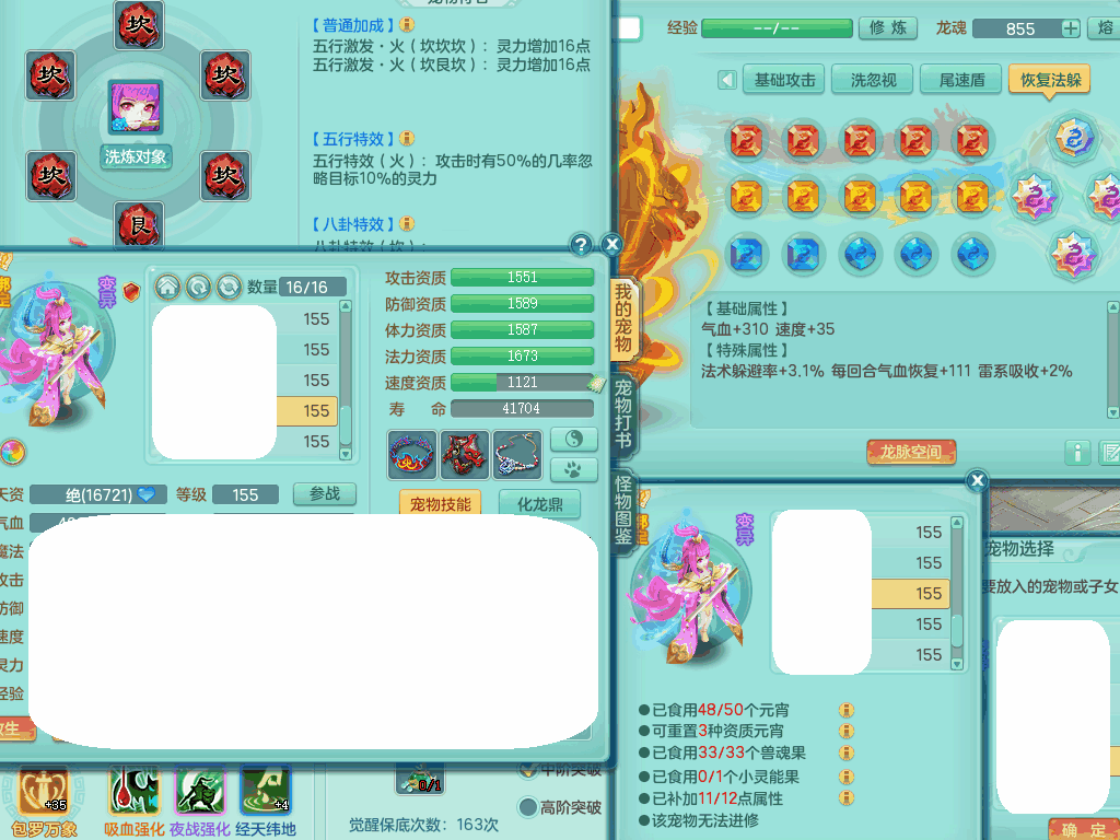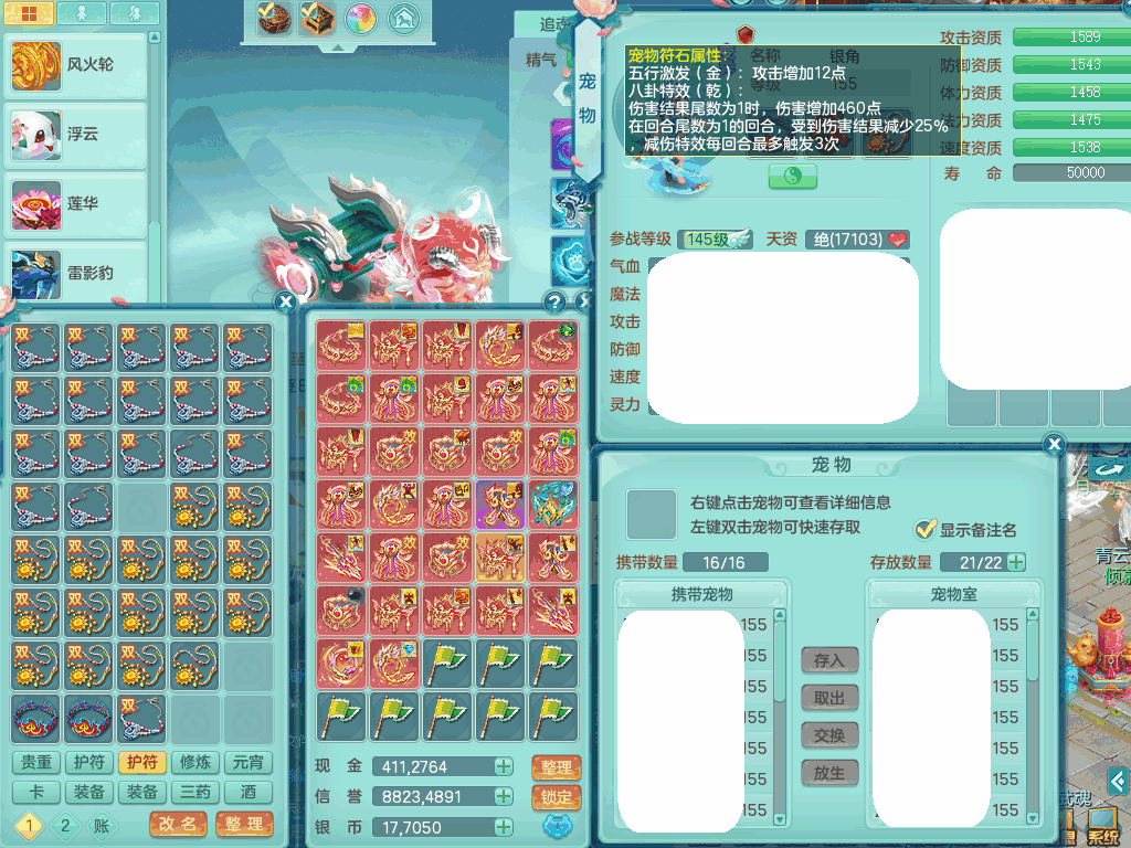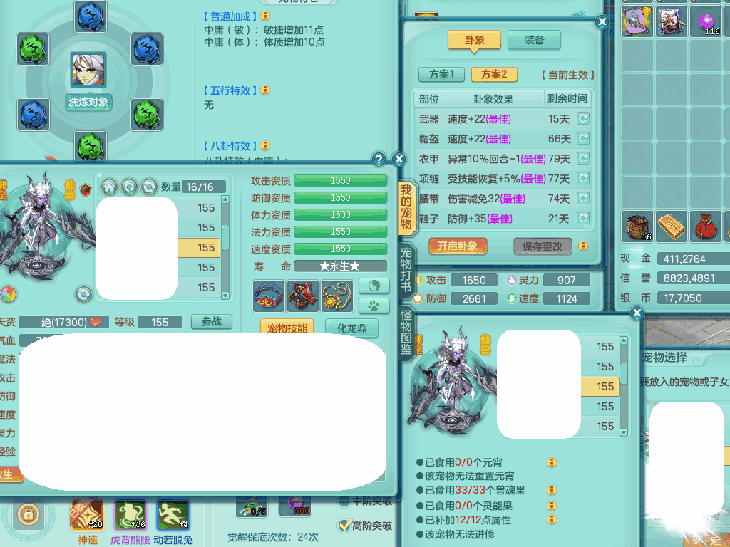 jn8405 【潜龙在渊】今年勇159女灵月山,精灵歌+舞,9龙7龙皮,3内胆神,4破镜,【16觉醒,已潜龙】,4宠皮,4位靓号,5只六技能镜子,1只六技能龙姬,3特殊(噬风,流星,灵傀),迅捷明镜单加56鞋子,有崩山单加53衣服,928狂暴单加54武器,6.0基础鼎+70攻、280血,15个格子,15个六字,4个五字,27只满果子,宠排在榜,经验修炼成就在榜,2页永久称谓,9个坐骑,暴龙泰坦+西瓜冰。2980邮箱