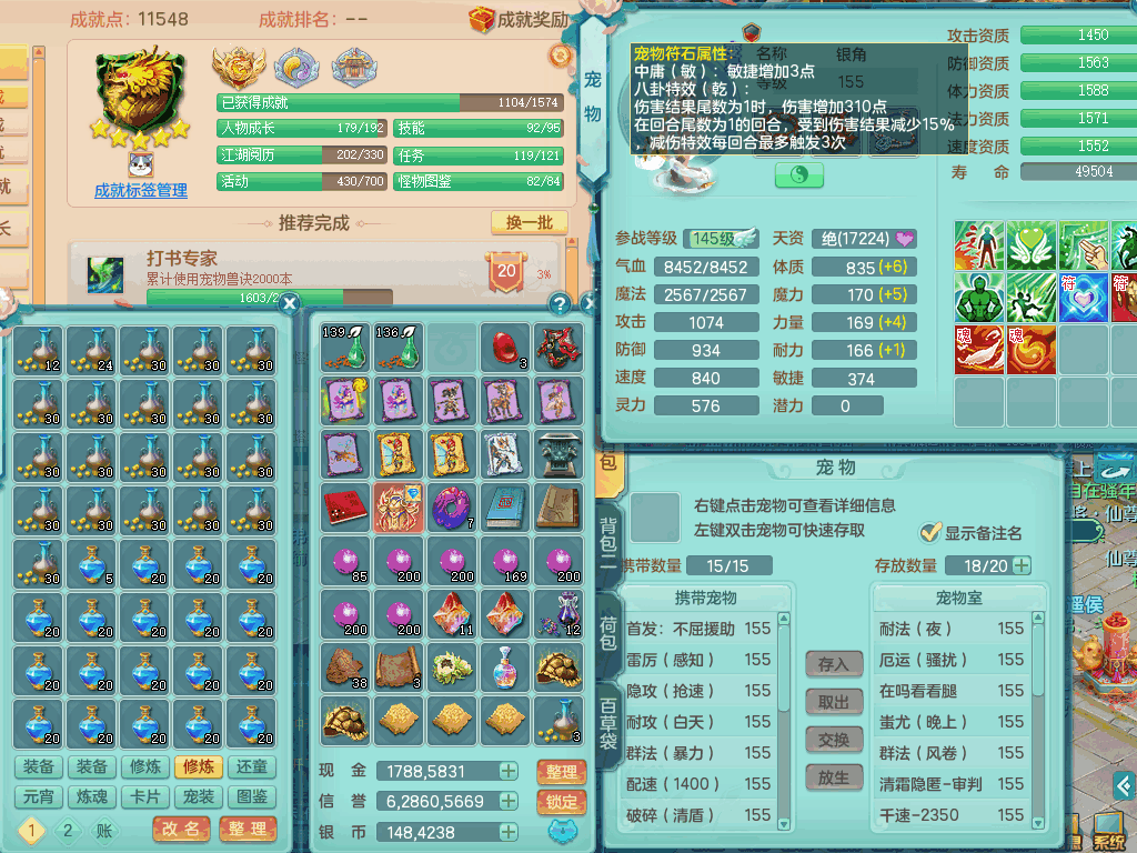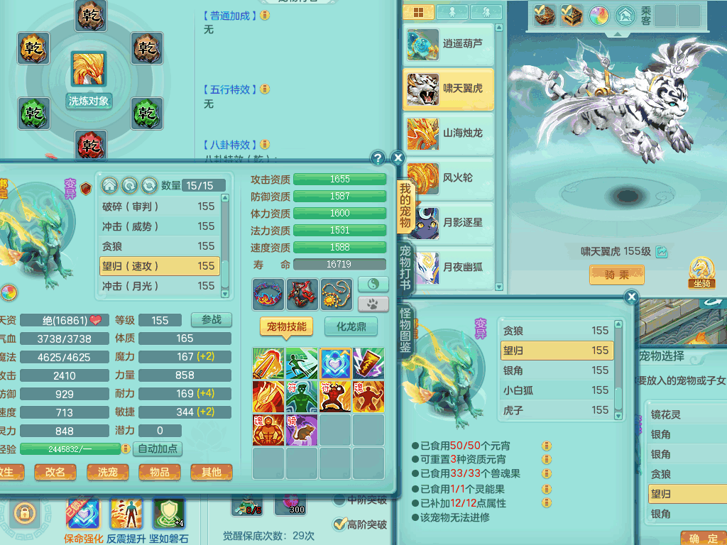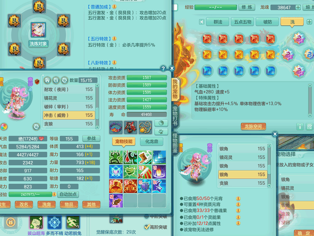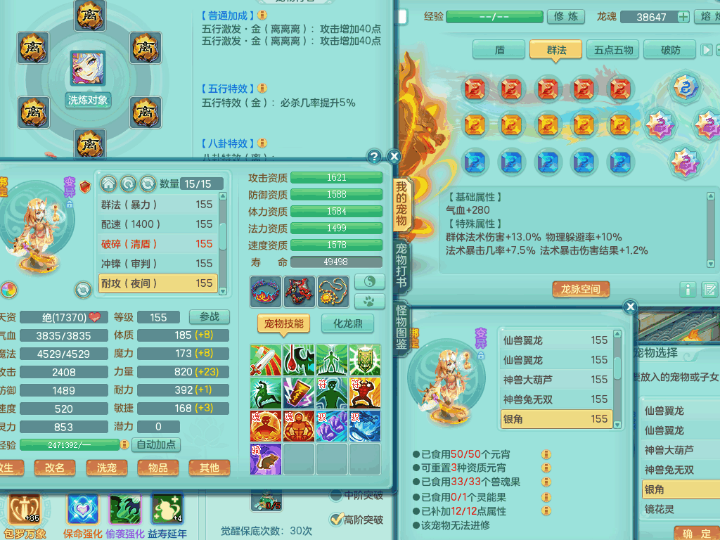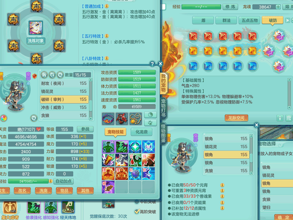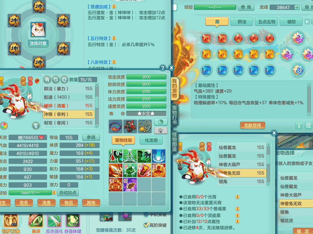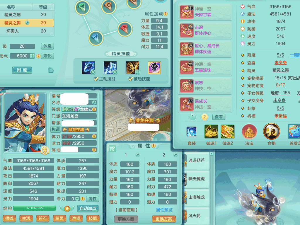 tx8441 天下无双159男龙宫,双精灵舞+盾,6龙3内胆神,2破镜,【9只觉醒,已潜龙】,8位靓号AABBAABB,10宠皮,2特殊(锤子,月光),2只六技能镜花灵,18段三红匠心易成长群疾衣服,5.5基础鼎+70攻+280血,15个格子,11个纯六字,2个五字,25只满果子,宠排在榜,经验修炼在榜,5个坐骑,带48天月卡。 2980邮箱