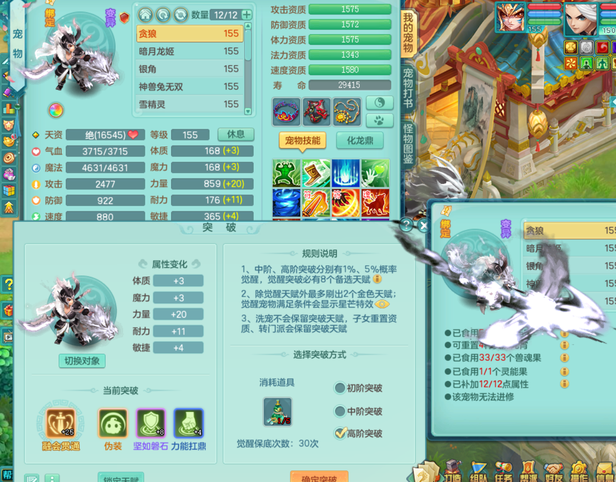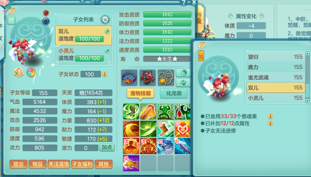 tx8504 天下无双 159无量 愤怒6特超级外观顶级实力辅助 15完美黑白染色双人特殊坐骑 9觉醒 2内神 11+满果 西瓜冰 镜子龙姬都有 化龙鼎5.5+气血280+全四级 各种毕业细节拉满该有的都有可以自己慢慢看 强化券保底差5次又可以凑一满技能镜子 仓库有各种替换 QQ不给 战盟7天