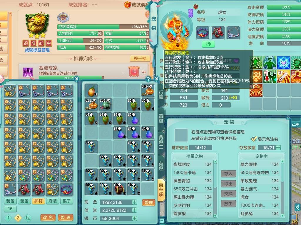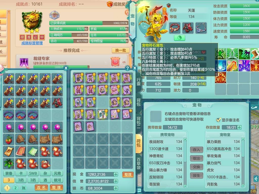 qq8619 七窍玲珑 129男方寸,精灵舞+歌,2龙(1龙无内),3内胆神,2只觉醒,5宠皮,愤怒激励单加腰带,6特,4.0基础鼎,23只满果子,仓库还有79个果子,宠排在榜,3只坐骑。 2980邮箱