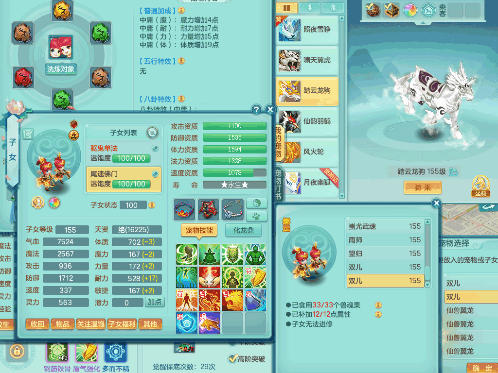 cy8666 【潜龙在渊】彩云追月159男天宫,精灵舞,7龙2内胆神,【12只觉醒,已潜龙】,8位靓号AABBBBCC,1宠皮,2只六技能镜花灵,5特殊(飞花,锤子,剑胆,月光,夺命),6.0基础鼎+70攻+280血,15个格子,13个纯六字,1个五字,25只满果子,仓库还有120个果子,1个神兽内胆,宠排经验修炼成就都在榜,永久称谓,5只坐骑。 2980邮箱