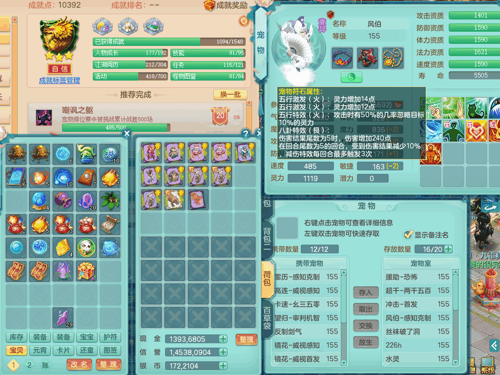 fc8739 风驰电掣159男方寸,精灵舞,3龙(1龙没内),7只觉醒,2特殊(影袭,祈雨),3只六技能镜花灵,愤怒破力式单加53腰带,迅捷四海鞋子,5.5基础鼎,4个纯六字,综合9只满果子,背包29神兽内丹碎片,2个双人坐骑。带4个150奶粉。 QQ邮箱