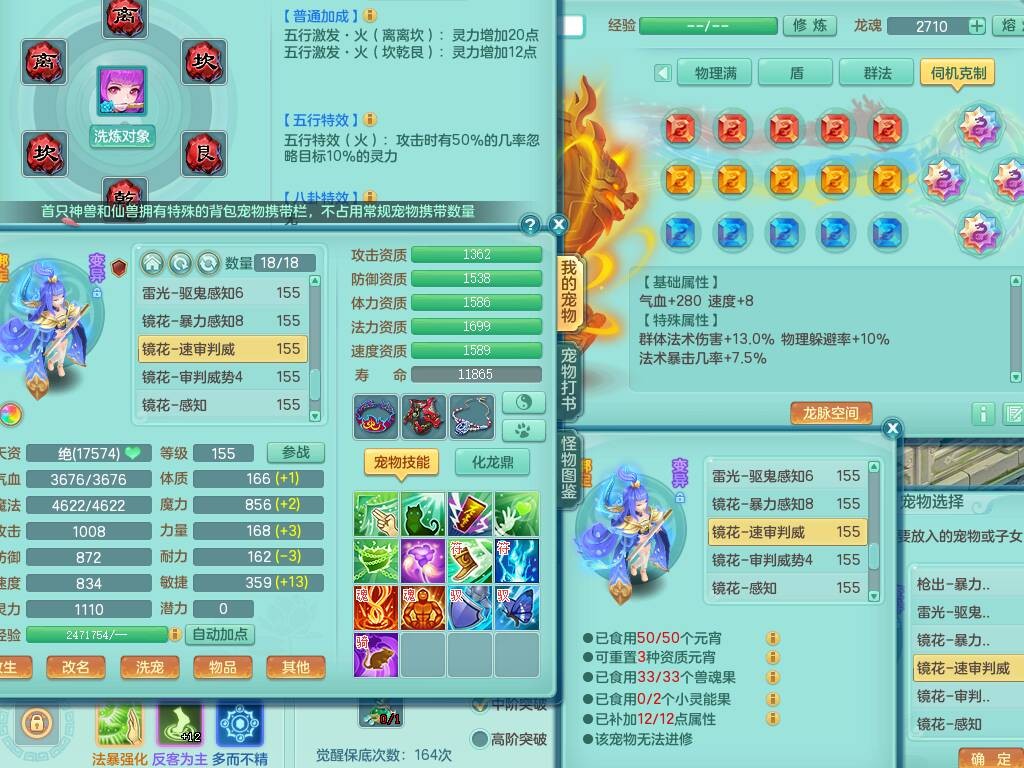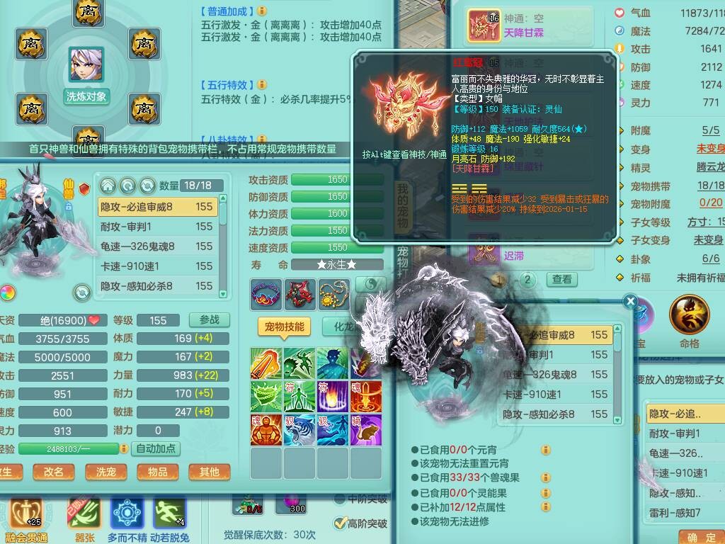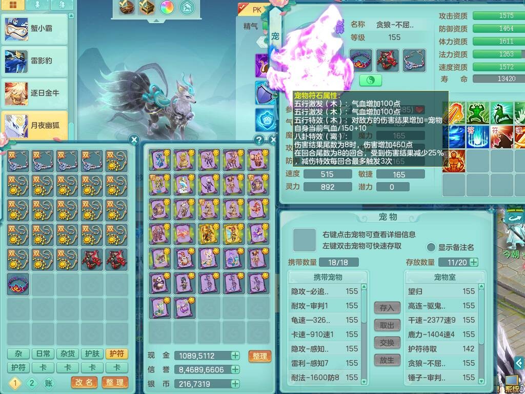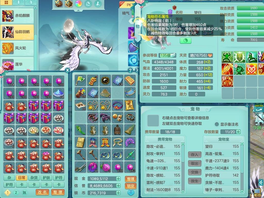sn8757 【潜龙在渊】 少年游159女普陀,精灵舞,8龙1龙皮,4内胆神,2破镜,【13只觉醒,已潜龙】,4位靓号不含4,3宠皮,5只六技能镜花灵,2特殊(雷光,怒破),愤怒五特,5.5基础鼎+70攻+280血,15个格子,26个纯六字,27只满果子,宠排经验修炼成就都前排,永久称谓,9个坐骑,暴龙泰坦+西瓜冰,冰晶庭院,带134天月卡,3.2万金币,216万神武币。带3个150奶粉。 2980邮箱