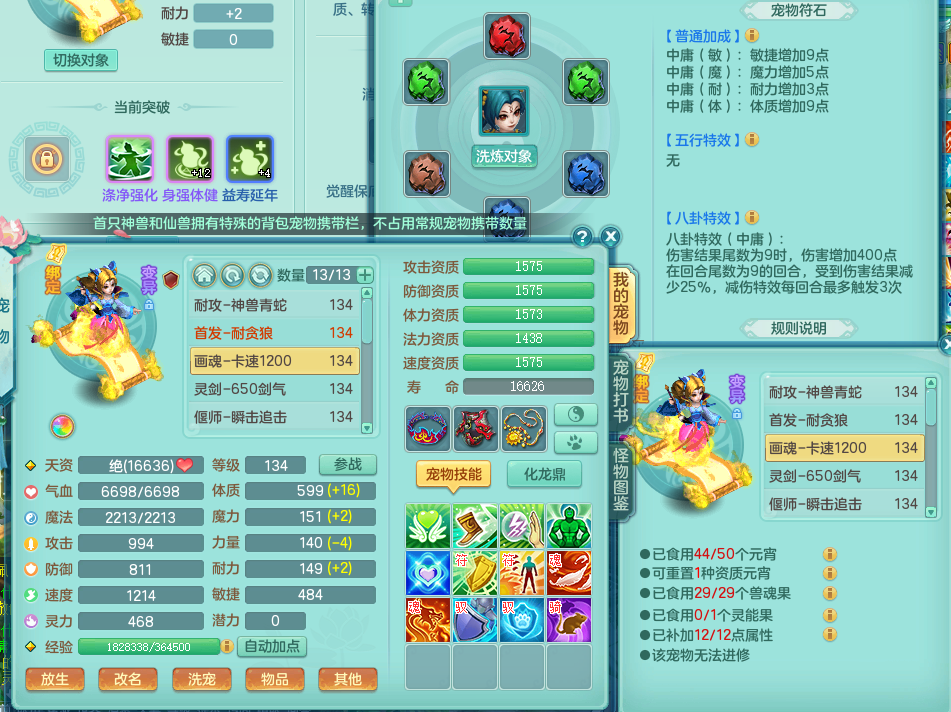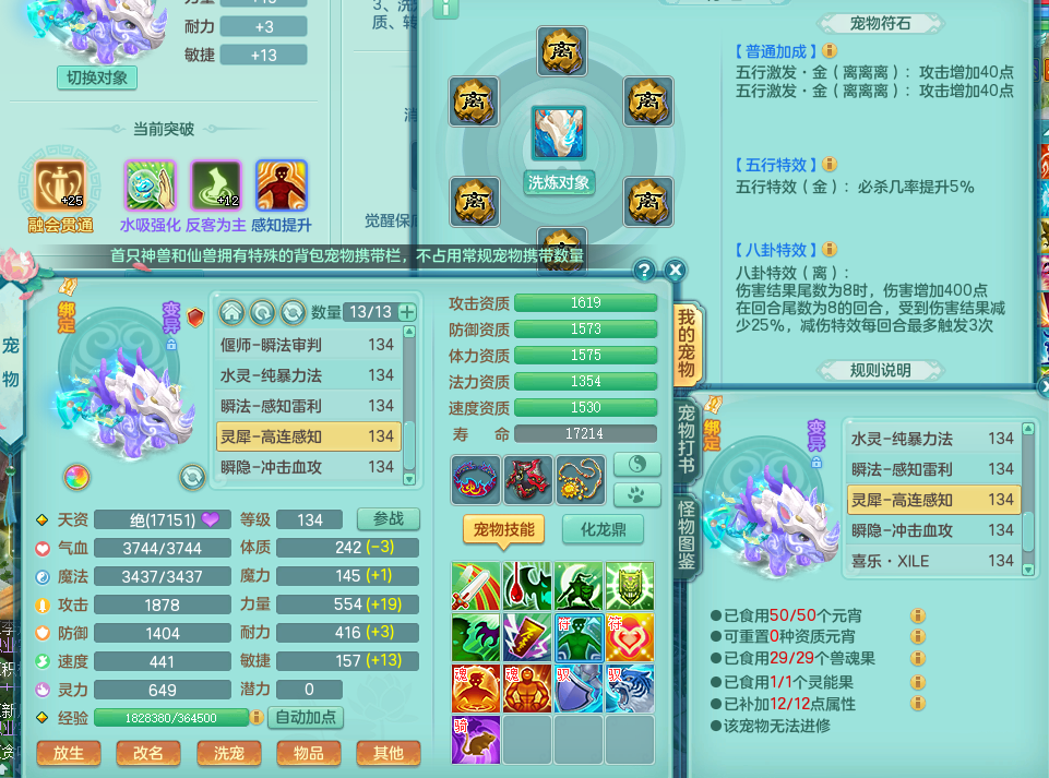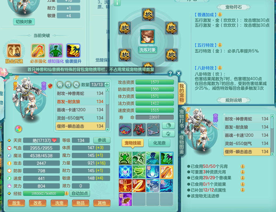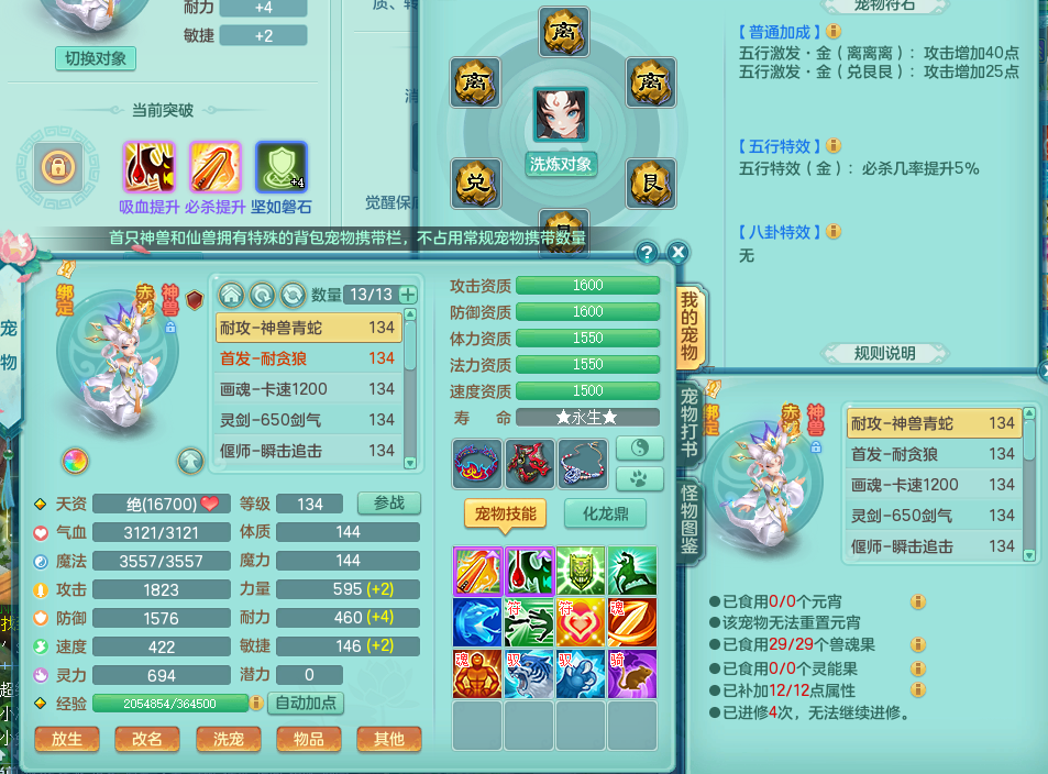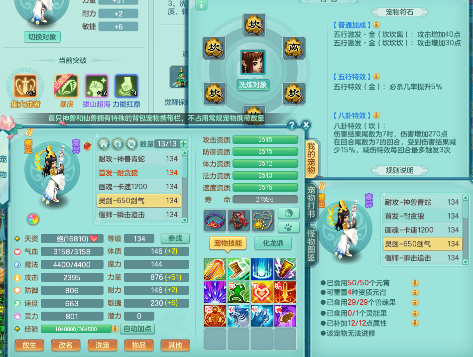 jx8854 【潜龙在渊】锦绣河山 129万兽 双人坐骑 精灵歌 满星穹 。鼎4.0基础。7.5法爆 1龙无内 1内神 13个纯6字,全部离坎,就一个法师是兑。10觉醒。身上毕业辅助装备。有效双红。 QQ邮箱