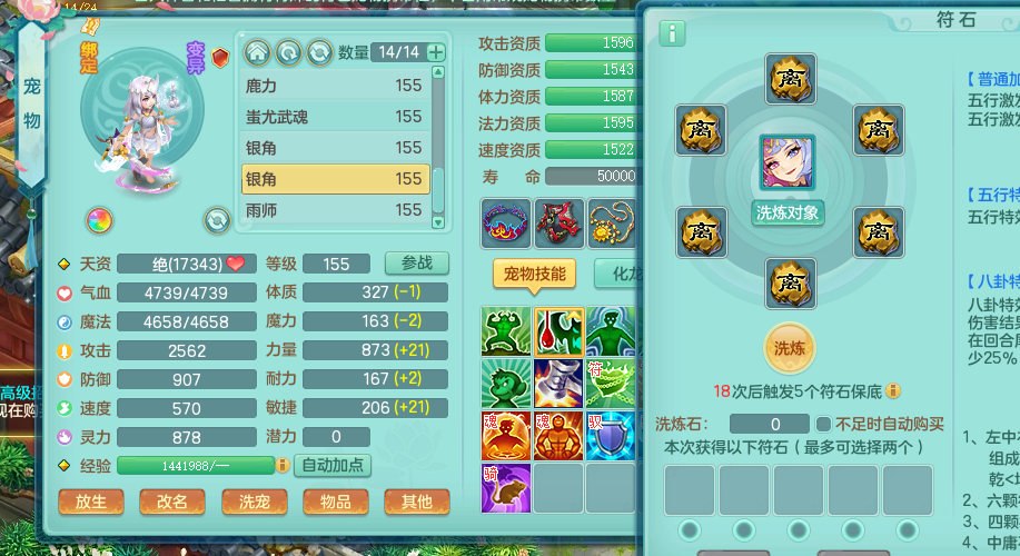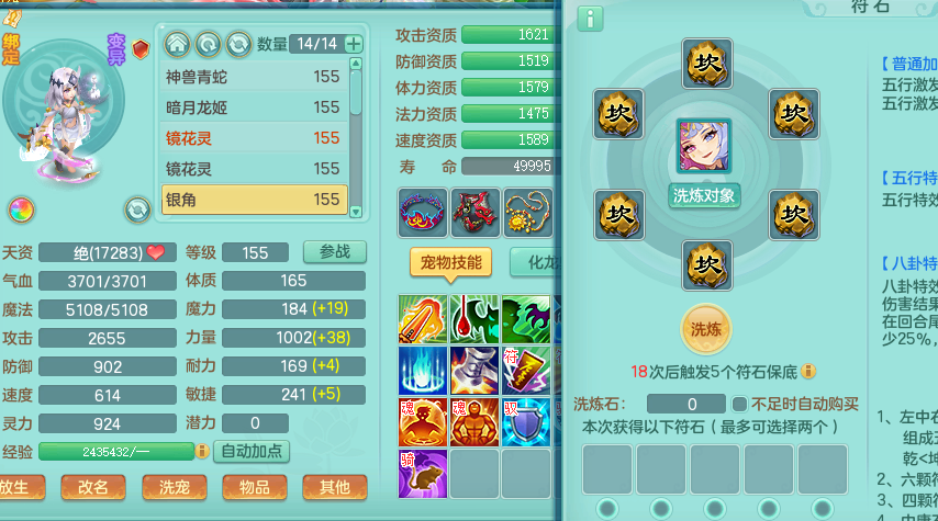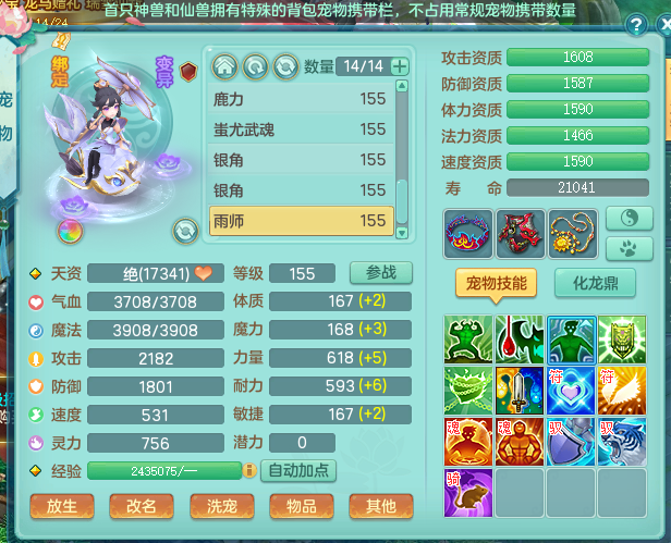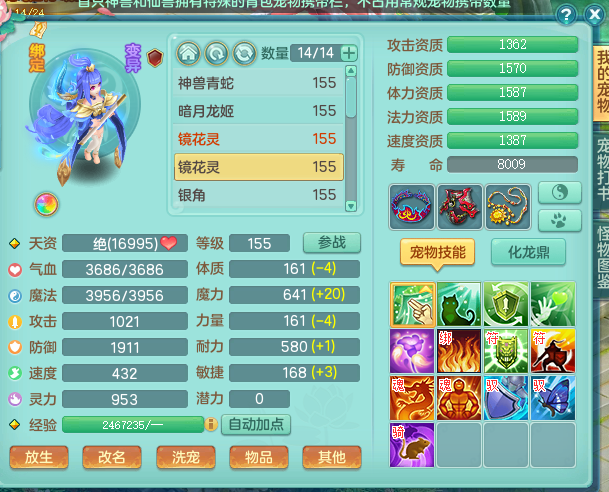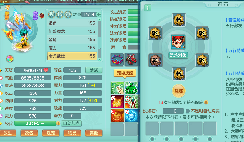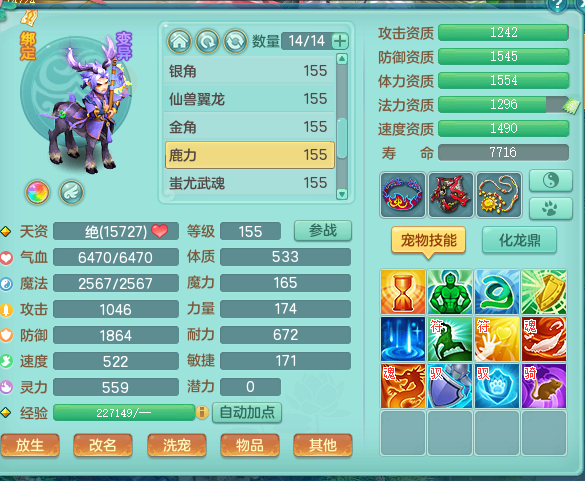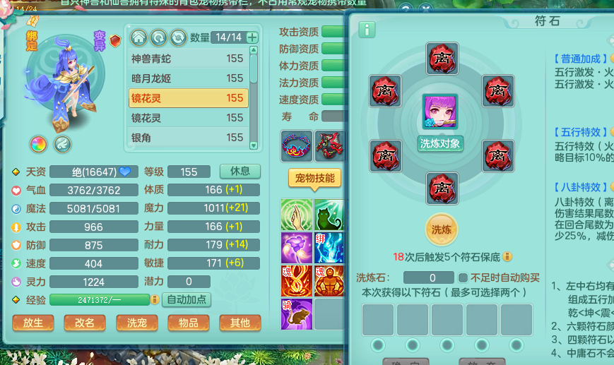 zw8870 【潜龙在渊】 战无不胜159男天宫,精灵舞,2龙1内胆神,7觉醒,6宠皮,7特殊(2锤子,舍身,翻江,善恶,雷厉,坠天),2只6技能镜花灵,1只六级能龙姬,6.0基础鼎+70攻,280血,物理躲避10%,7个纯六字,4个5字,12只满果子,修炼在榜,背包54仙兽蛋,2只双人坐骑,1只新坐骑原始暴龙,月卡还有95天。带2个150奶粉。 qq邮箱